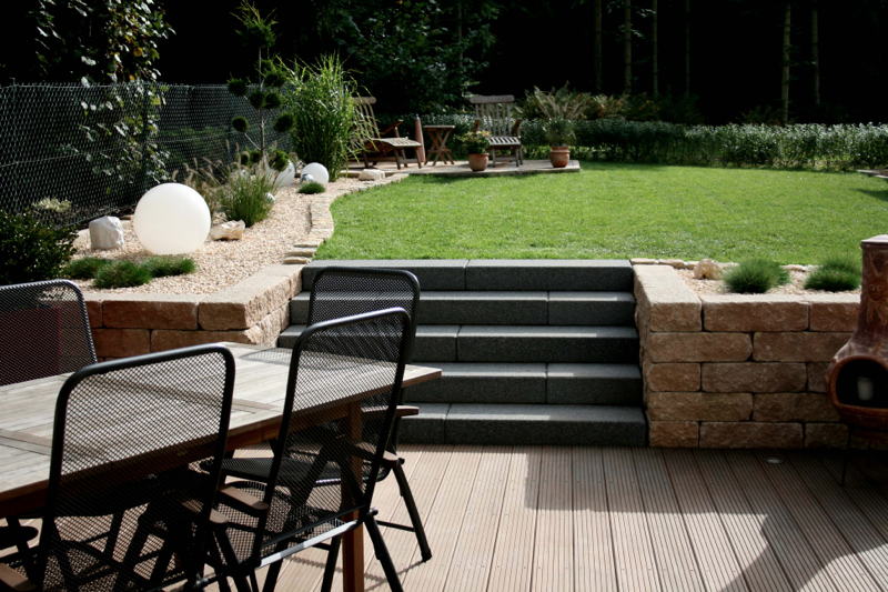 - großzügiger Treppenaufgang zur Rasenfläche mit Gerätehütte und Sonnendeck aus Hartholz (Bangkirai)